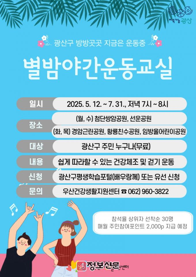 광산구 관계자는 “바쁜 일상을 마친 시민이 저녁 시간 몸을 움직이며, 건강한 생활 습관을 형성하도록 돕기 위해 야간운동교실을 마련했다”며 “땀 흘리는 즐거움을 나눌 ‘별밤운동족’으로 함께 할 시민의 참여를 기다린다”고 전했다.