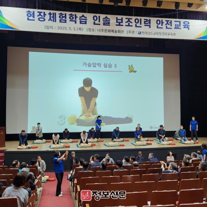 이번 교육은 5월 1일 나주(중부권)를 시작으로, 2일에는 순천(동부권)과 무안(서부권)에서 이어지며, 총 450여 명의 인솔 보조인력을 대상으로 실시된다. 주요 내용은 ▲ 심폐소생술 등 응급처치 실습 ▲ 학교 안전교육 등으로 구성돼 있다.