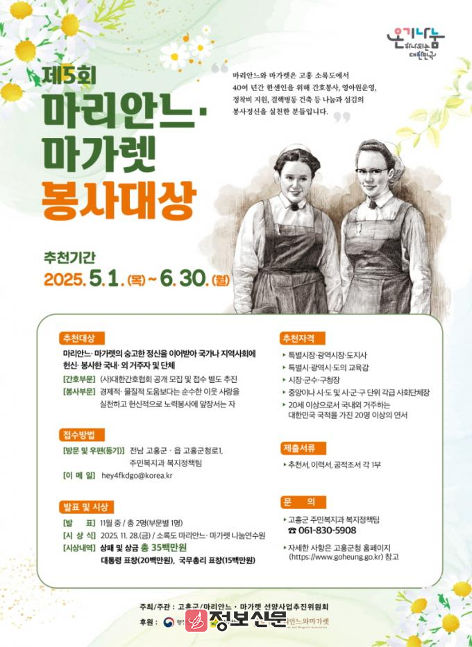 ![]() 고흥군, 제5회 마리안느·마가렛 봉사대상 후보자 추천 공모 |