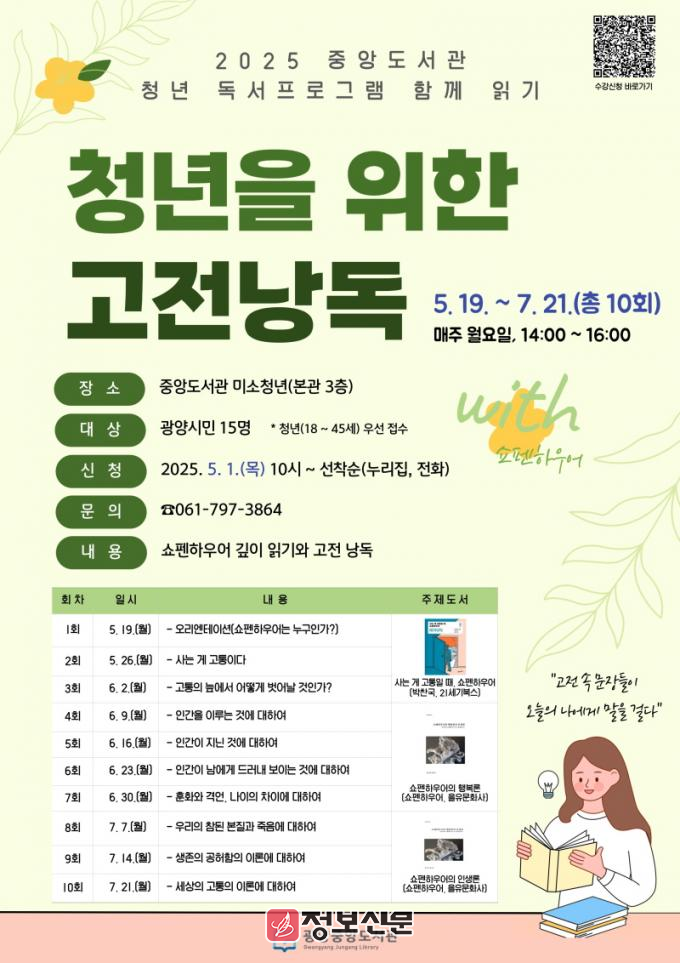 ![]() 광양중앙도서관, 「청년을 위한 고전낭독」 수강생 모집 |