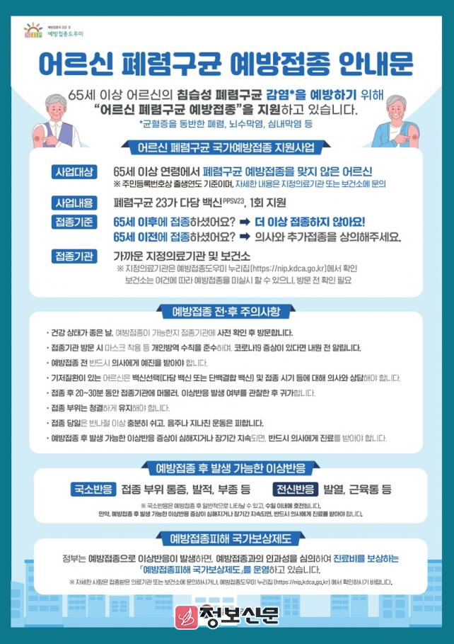 동부보건소 관계자는 “감염병 예방 및 건강한 노후 생활을 위하여 폐렴구균 예방접종에 참여해 주시기를 당부드린다.”라고 말했다.