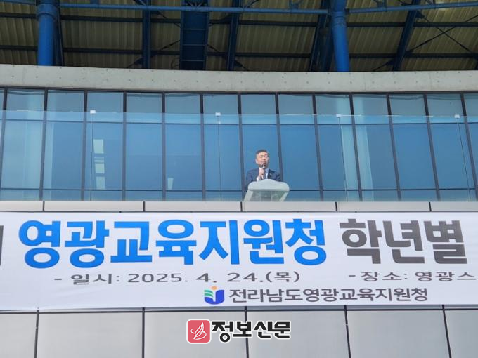 사진 설명 : 박원종 전라남도의원이 지난 4월 24일 제29회 영광교육지원청 학년별 육상경기대회에서 참석하여 축사를 하고 있다.