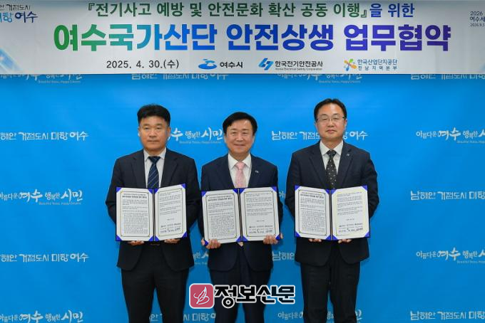 ![]() 여수시(시장 정기명)가 지난달 30일 시장실에서 한국산업단지공단 전남지역본부, 한국전기안전공사 여수지사와 여수국가산단 안전상생을 위한 업무협약을 체결했다. |