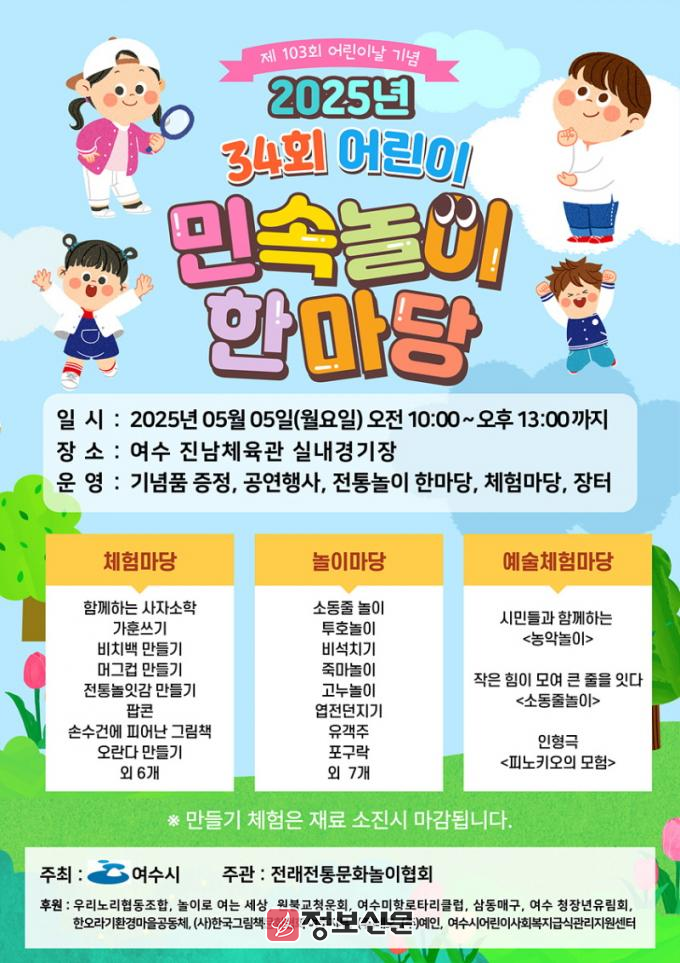![]() 여수시, 제103회 어린이날 기념 민속놀이 한마당 5일 개최 |