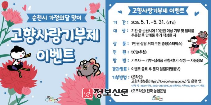 ![]() 순천시, 고향사랑기부제 가정의 달 맞이 특별 이벤트 실시 |