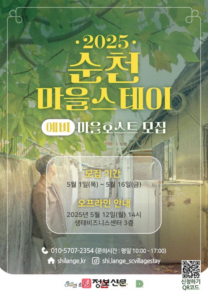 신청은 5월 1일(목)부터 5월 16일(금) 오후 6시까지 이메일, 네이버 설문 또는 방문 접수로 가능하며, 자세한 사항은 순천시청 누리집과 순천마을스테이 공식 누리집(www.shilange.kr)에서 확인할 수 있다.