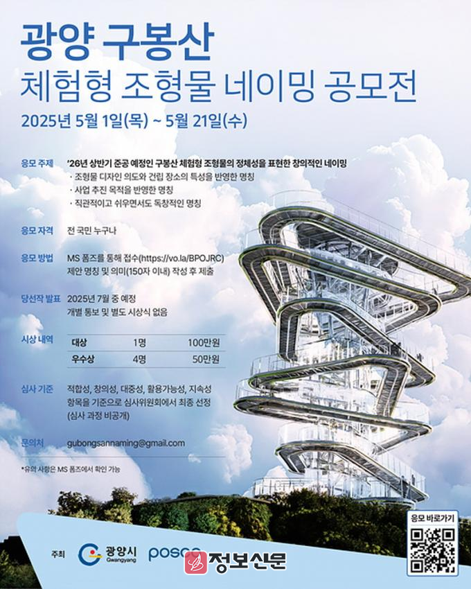 김미란 광양시 관광과장은 “빛과 철의 도시 광양을 상징하는 구봉산 체험형 조형물은 시와 포스코의 영원한 상생과 협력을 기념하는 랜드마크로 자리매김할 것”이라며 “이번 명칭 공모는 시민과 국민이 함께 조형물의 의미를 완성해가는 소중한 과정인 만큼, 모두가 공감할 수 있는 국제적 명칭이 탄생하길 기대한다”고 말했다.