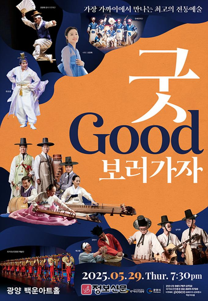 국가유산진흥원의 대표 브랜드 공연인 ‘굿GOOD보러가자’는 2004년부터 시작된 옴니버스 형식의 전통예술 지역 순회공연이다. 공연 개최지는 매년 전국 지자체 공모를 통해 서류심사와 현장 실사를 거쳐 선정되며, 지금까지 전국에서 총 121회 개최된 바 있다.