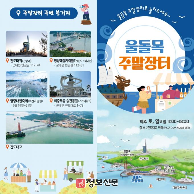 울돌목 주말장터는 5월 3일 개장식을 시작으로 진도군에서 생산한 특산품과 농·수산물을 활용해 만든 요리를 판매함으로써 상인들과 관광객이 소통하는 공간으로 운영될 예정이다.