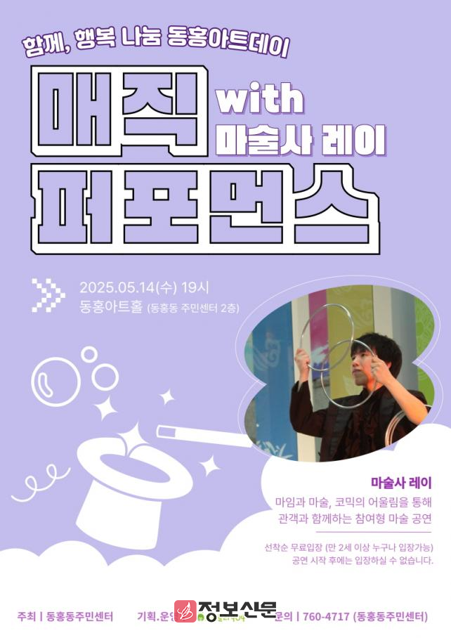 5월 첫 번째 공연으로 준비된 마술사 레이의 매직 퍼포먼스는 제주 전역을 기반으로 활발히 활동하고 있는 마술사 레이가 팬터마임과 유쾌한 말솜씨를 곁들인 마술쇼를 선보일 예정으로 어린 친구들뿐만 아니라 어른들의 마음도 사로잡을 것으로 기대된다.