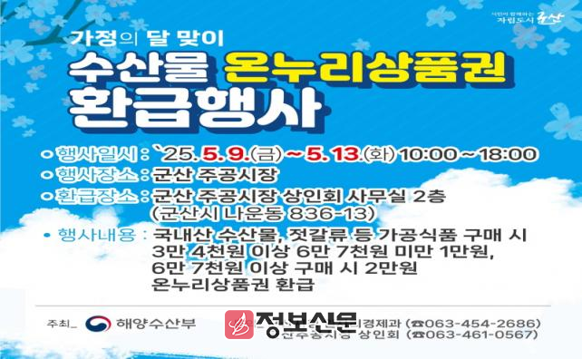 ![]() 군산시, 5월 가정의 달 맞이 수산물 온누리상품권 환급행사 진행 |