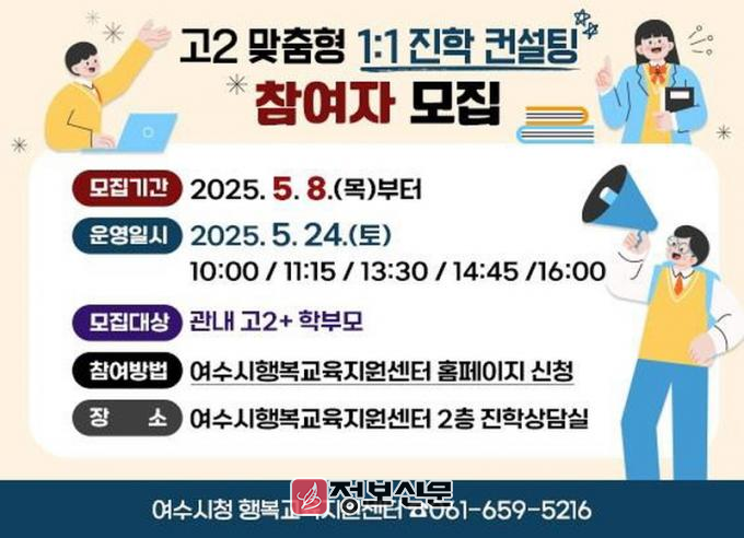 ![]() 여수시(시장 정기명)는 관내 고2 학생과 학부모를 위해 오는 24일(토) 행복교육지원센터에서 맞춤형 1:1 진학 컨설팅을 운영한다고 밝혔다. |