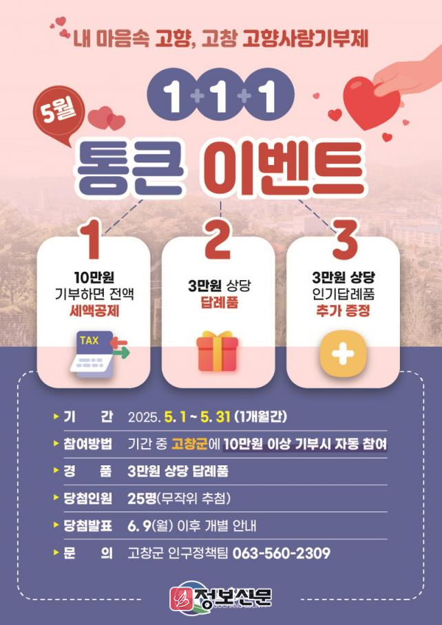 고창군 관계자는 “5월 가정의 달을 맞아 고향을 사랑하는 마음을 전하는 기부자들에게 감사의 마음을 특별한 혜택으로 보답하고자 이번 이벤트를 마련했다”라며, “이번 ‘1+1+1 통큰 이벤트’를 통해 더 많은 분들이 고향사랑기부제에 동참하고, 고창의 매력을 느껴보시길 바란다”라고 전했다.