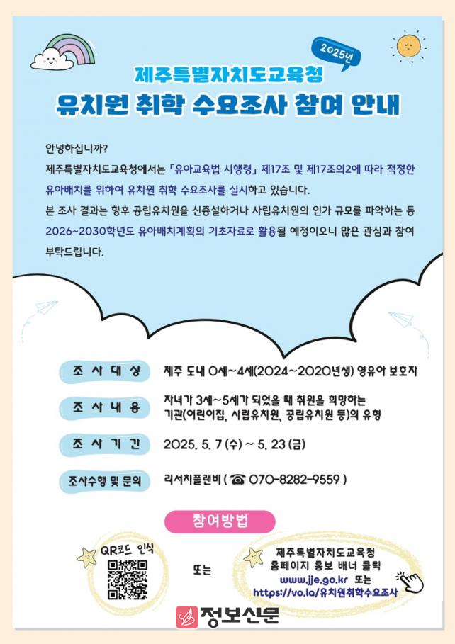 한편, 제주도교육청 관계자는“이번 수요조사는 유아교육 정책 수립과 맞춤형 배치 계획의 핵심 자료로 활용된다”며“보호자님들의 적극적인 참여를 부탁드린다”고 말했다.