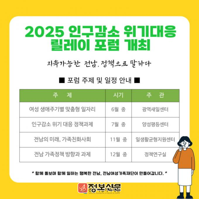 ![]() 전남여성가족재단, 인구감소 위기 대응 위한 릴레이 포럼 개최