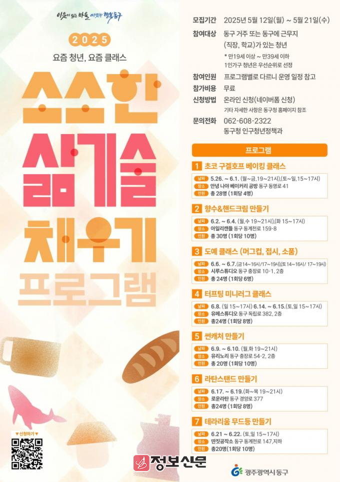 임택 동구청장은 “이번 프로그램은 청년들이 바쁜 일상 속에서도 자신만의 시간을 갖고, 실용적인 기술을 익히며 자기 개발과 사회 참여의 기회를 얻을 수 있도록 기획됐다”면서 “앞으로도 청년들의 삶에 활력을 불어넣을 수 있는 다양한 프로그램을 지속적으로 발굴해 나가겠다”고 말했다.