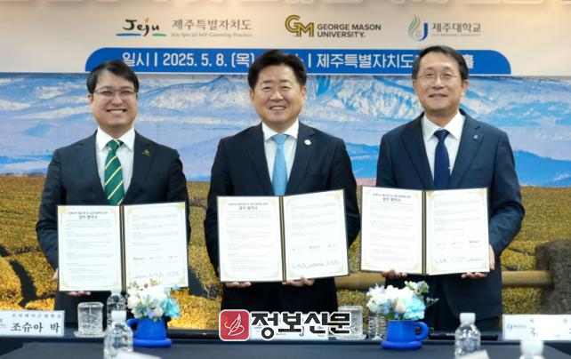 협약식에는 오영훈 도지사와 조지메이슨대학교 한국 캠퍼스 대표 조슈아 박, 김일환 제주대학교 총장 등이 참석했다.