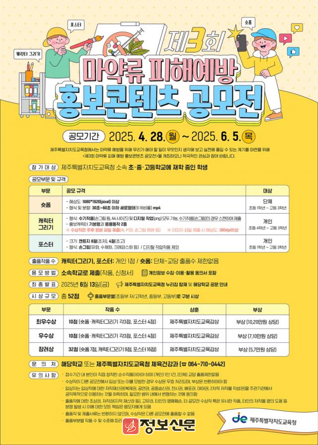 ![]() 제주특별자치도교육청, 제3회 마약류 피해예방 홍보물 공모전 개최 |