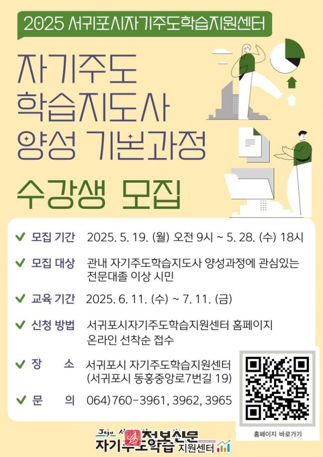 모집 대상은 도내 자기주도학습에 관심 있는 전문대졸 이상의 시민(20명)이며, 모집 기간은 5월 19일부터 5월 28일까지 서귀포시 자기주도학습지원센터 홈페이지(https://edu.seogwipo.go.kr/self/index.htm)를 통해 선착순 접수로 진행된다.