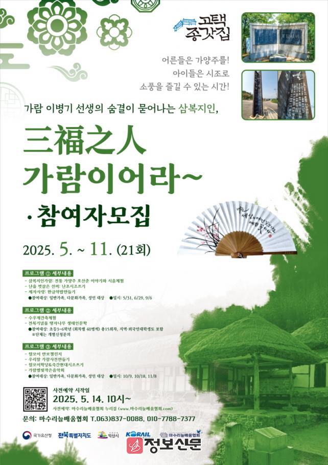 참여 신청은 오는 14일 오전 10시부터 마수리늘배움협회 누리집(www.마수리늘배움협회.com)에서 가능하다. 자세한 문의는 전화(063-837-0088)로 하면 된다.