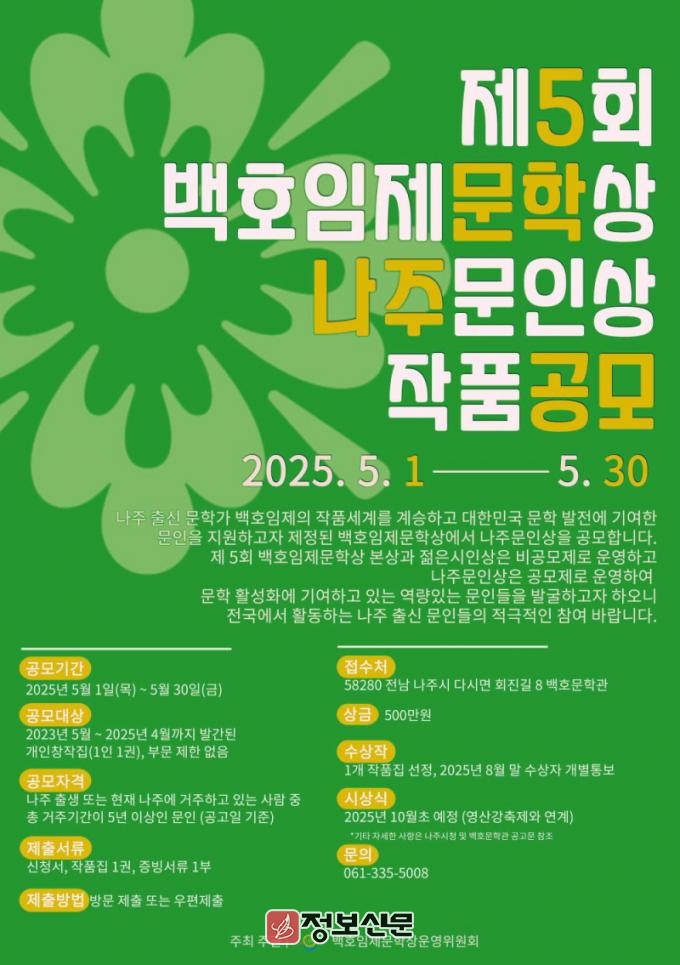 자세한 사항은 시청 누리집 공고문을 참조하거나 백호문학관 문학상 담당자(061-335-5008)에게 문의하면 된다.