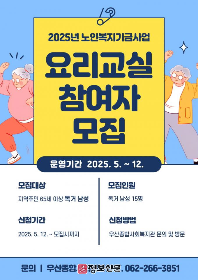 우산종합사회복지관은 오는 5월21일까지 15명을 모집해 요리교실, 요리경연대회를 운영한다. 무등종합사회복지관은 5월15일까지 20명을 모집해 건강식단교실, 저속노화 챌린지, 한끼나눔 챌린지를 진행한다. 광주공원노인복지관은 5월22일까지 20명을 모집해 요리, 영양관리 교육, 장보기 실습 등을 실시한다.