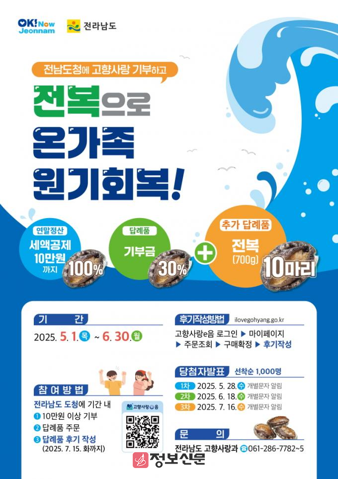 ![]() 전라남도, 가정의 달 고향사랑기부 ‘전복’ 이벤트 진행 |
