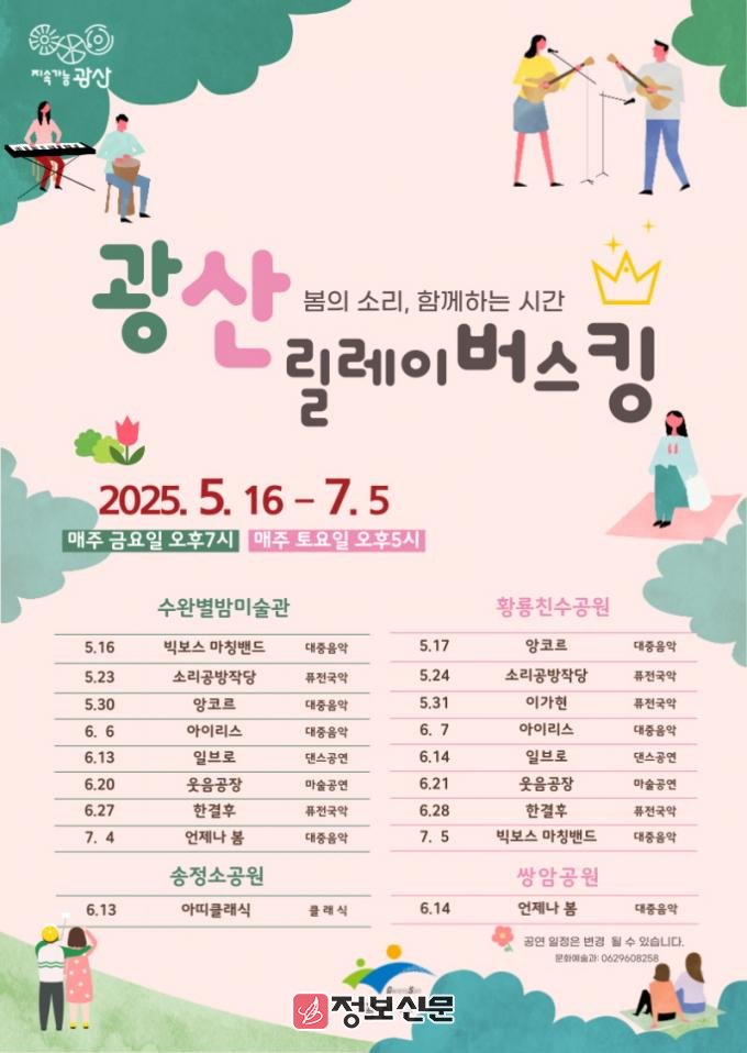 이번 공연은 봄의 소리, 함께하는 시간을 주제로 △클래식 △대중음악 △퓨전 국악 등 다양한 장르의 공연이 펼쳐진다. 장소는 △풍영정천변길근린공원(수완 별밤미술관 앞) △황룡친수공원(놀이시설 인근) △우산동 송정소공원 △첨단쌍암공원(야외공연장 인근)에서 열린다.