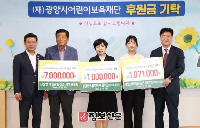 정인화 광양시장은 “어린이보육재단에 기부해 주신 따뜻한 마음과 관심에 깊은 감사를 드린다. 여러분들의 소중한 마음은 우리 지역 영유아들을 위한 소중한 자원이 될 것이며, 광양시 또한 지역사회의 복지 향상을 위해 협력해 나가겠다. 앞으로도 어린이보육재단에 많은 관심을 부탁드린다”고 전했다.