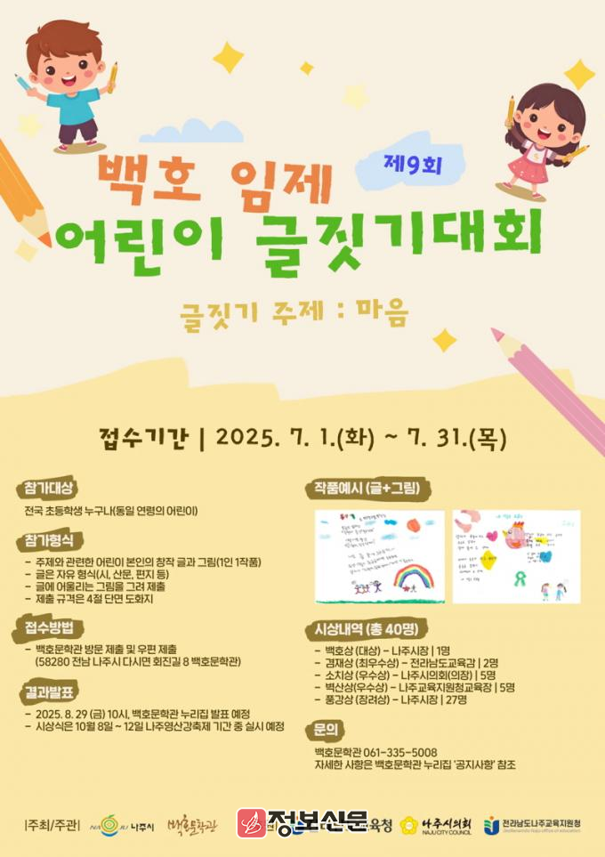 나주시 관계자는 “마음이라는 소재를 어린이만의 시선으로 다양하게 풀어내는 뜻깊은 시간이 될 것”이라며 “전국 어린이들의 기발하고 재미있는 작품이 많이 접수되길 기대한다”고 말했다.대회 일정과 접수 방법 등 자세한 내용은 나주시청 누리집 공지사항 또는 백호문학관 누리집에서 확인할 수 있다.