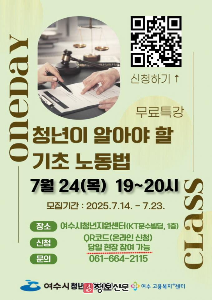 강의는 여수시청년지원센터(여수시 문수로 117) 회의실에서 열리며 청년들이 노동법 기초지식을 습득해 취업 관련 피해를 예방할 수 있도록 마련됐다. 대상은 지역 청년(18~45세)이며, QR코드를 통한 온라인 사전 신청과 당일 현장 접수가 모두 가능하다.