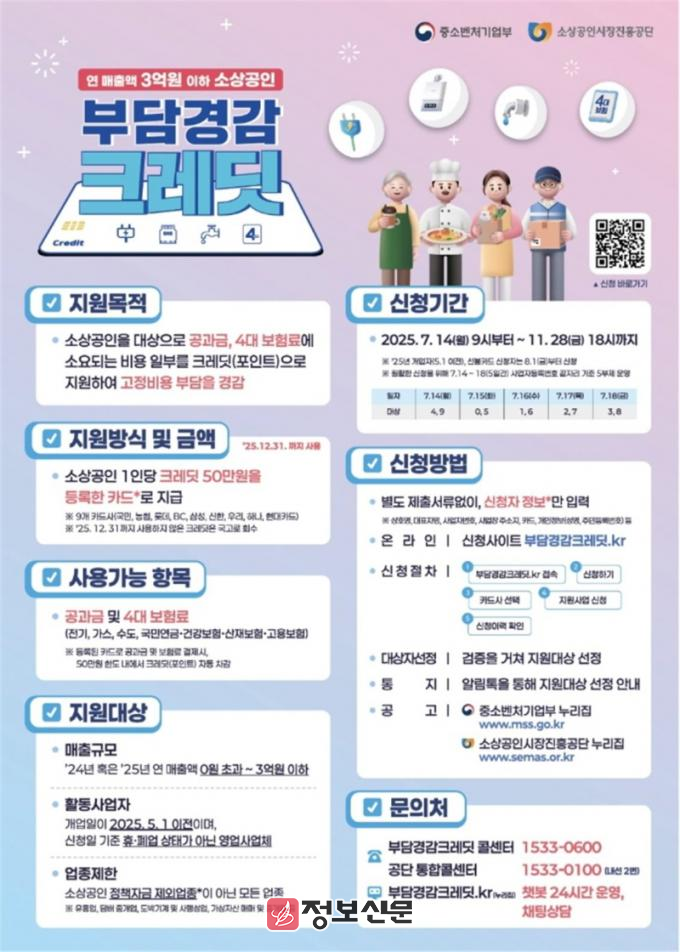신청 기간은 11월 28일 오후 6시까지이며, 온라인 전용사이트 ‘부담경감크레딧’또는 ‘소상공인24’를 통해 신청할 수 있다. 제외 업종은 유흥업, 담배 중개업, 도박 및 사행성 업종, 가상자산 매매 및 중개업 등이며, 매출액은 국세청 신고 매출액이 적용된다.