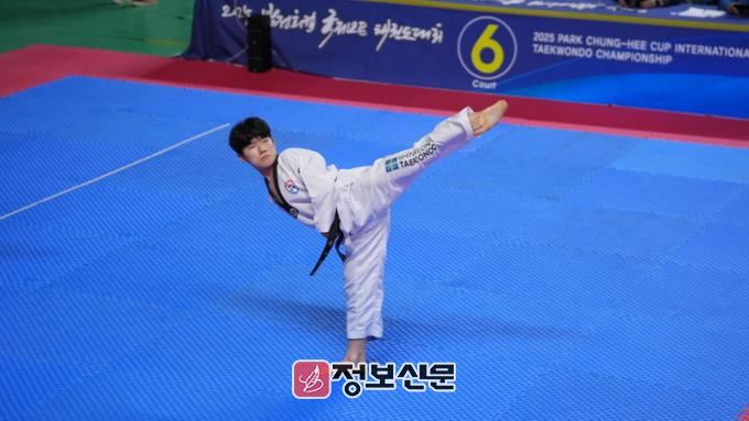 ![]() 지난 19일 경북 상주 실내체육관에서 진행된 ‘2025 박정희컵 국제오픈태권도대회’에 참가한 신천지예수교회 태권도 대표팀 배도원 선수가 공인품새 개인전에 출전해 품새 시연을 하고 있다. 이번 대회는 지난 18일부터 21일까지 경북 상주에서 진행된 태권도 국제대회다. |