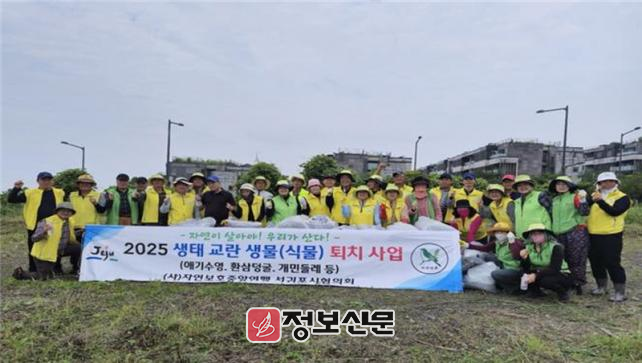 ‘2025년 6월부터 현재까지 4개 환경단체*에서 총 20회, 4백여 명이 참여한 가운데 칠십리시공원, 걸매생태공원, 공천포전지훈련센터 등지에서 서양금혼초, 애기수영, 환삼덩굴 등 생태계교란 식물 5톤을 제거하였으며, 10월까지 사업을 지속 추진해 나갈 예정이다.
