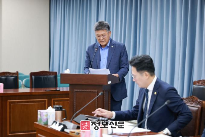 ![]() ▲신의준 전남도의원(더불어민주당, 완도2)이 9월 9일 농수산위원회에서 ‘전복 가두리 감축 보상 제도화 방안 마련 촉구 건의안’ 제안설명을 하고 있다.