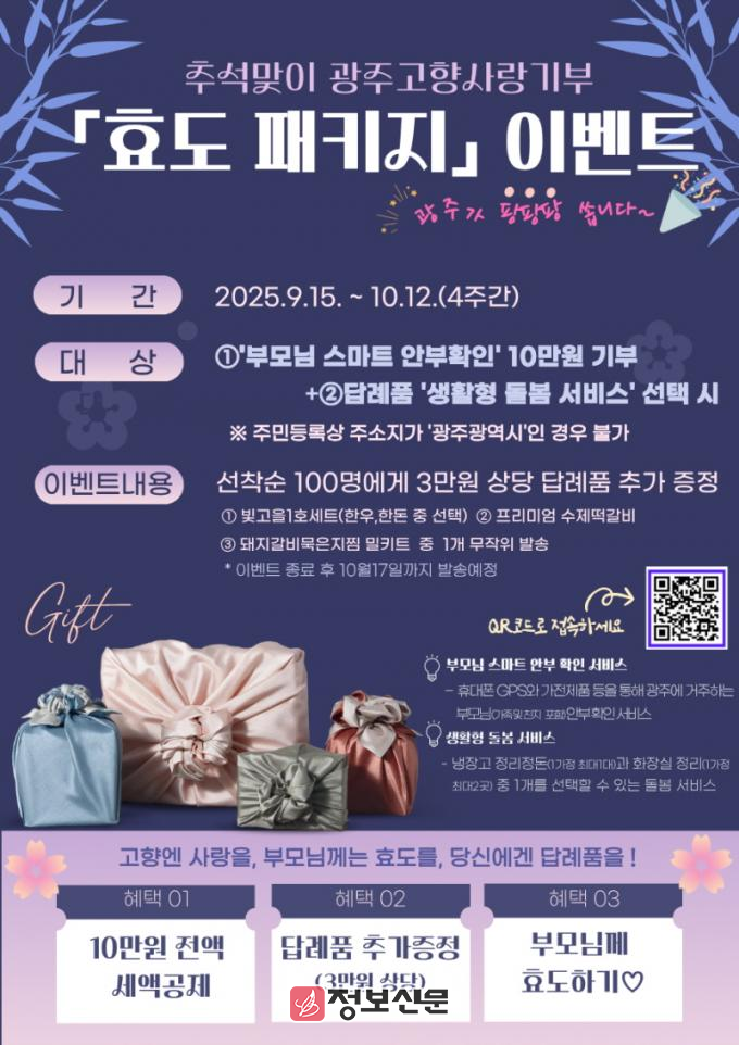 광주광역시(시장 강기정)는 오는 10월12일까지 고향사랑기부제 참여를 독려하고 부모님 돌봄서비스 이용을 장려하기 위해 ‘추석맞이 효도패키지 이벤트’를 진행한다.