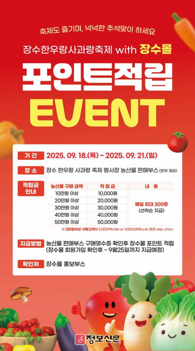 ![]() 장수군, 한우랑사과랑 축제 연계 장수몰 포인트 적립 이벤트 진행 |