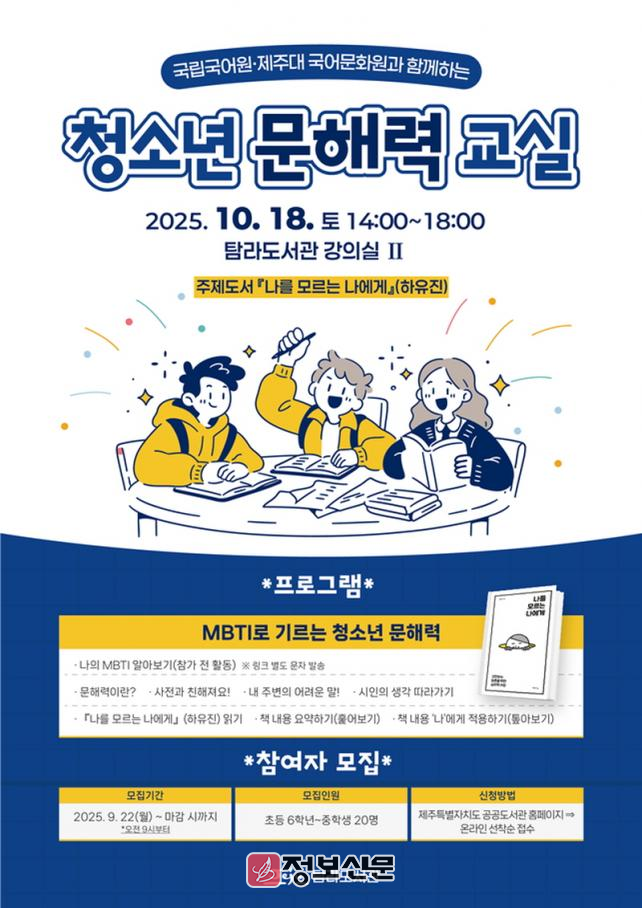 ![]() 탐라도서관, 제주대 국어문화원과 청소년 문해력 교실 운영 |