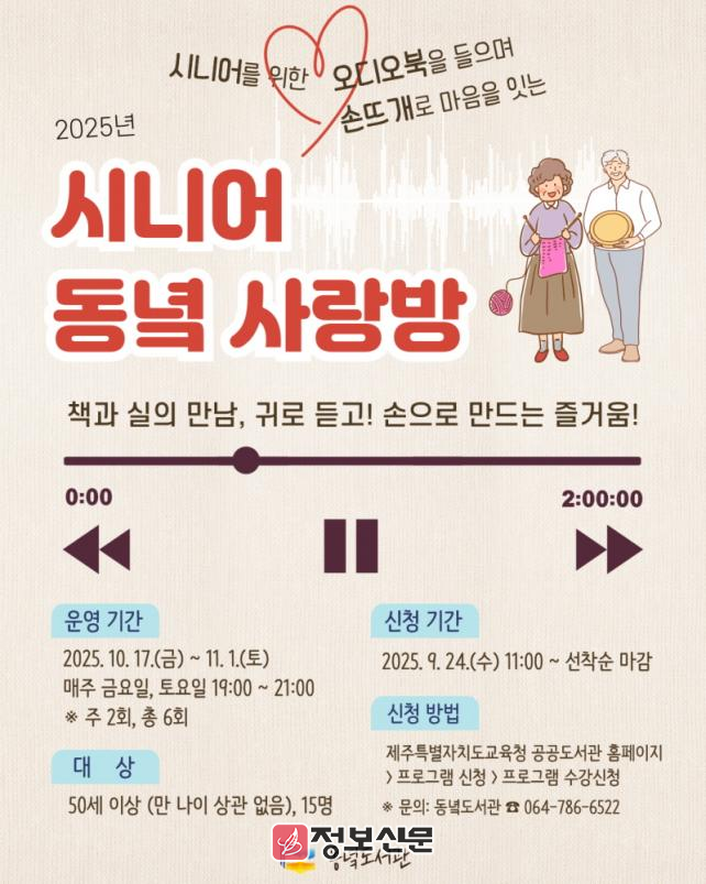 참여 대상은 50세 이상 성인(만 나이 무관) 15명이며 수강 신청은 오는 24일 오전 11시부터 제주특별자치도교육청 공공도서관 누리집(https://org.jje.go.kr/lib)을 통해 선착순으로 진행된다.
