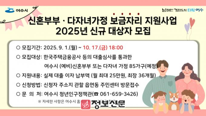 여수시 관계자는 “내 집 마련을 꿈꾸는 신혼부부와 다자녀가정에 실질적인 도움이 되길 바란다”며 “앞으로도 출산·양육하기 좋은 환경 조성을 위해 다양한 정책을 추진하겠다”고 말했다.