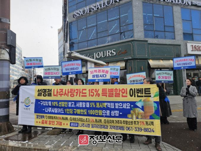 ![]() 나주시가 지역경제 활성화를 위해 10월부터 나주사랑상품권 할인율을 확대 판매한다. 사진은 2025년 설맞이 지역경제 활성화 캠페인 모습. (사진 제공-나주시) |