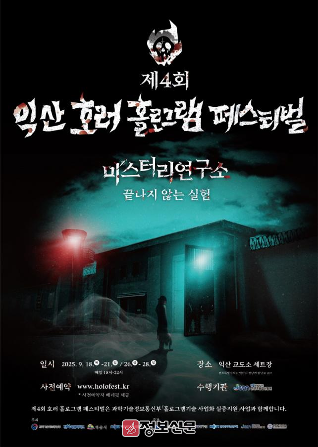 올해 4회째를 맞은 “익산 호러 홀로그램 페스티벌”은 홀로그램 기술과 호러를 융합한 이색 공포 축제로, 9월 18일(목) ~ 21일(일), 9월 26일(금) ~ 28일(일)까지 총 7일간 매일 18:00~22:00 운영한다. 특히 사전예약자가 1만 3천 명을 돌파하며 높은 관심을 입증했다.