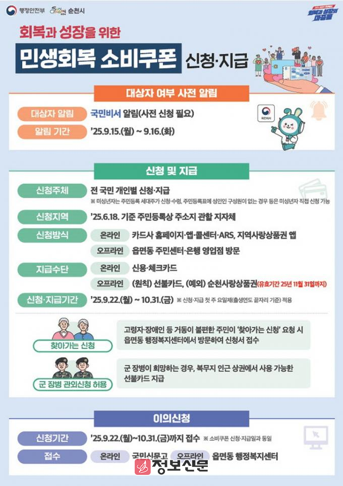 ![]() 순천시, 22일부터 2차 소비쿠폰 지급 추석 민생 안정 총력 |