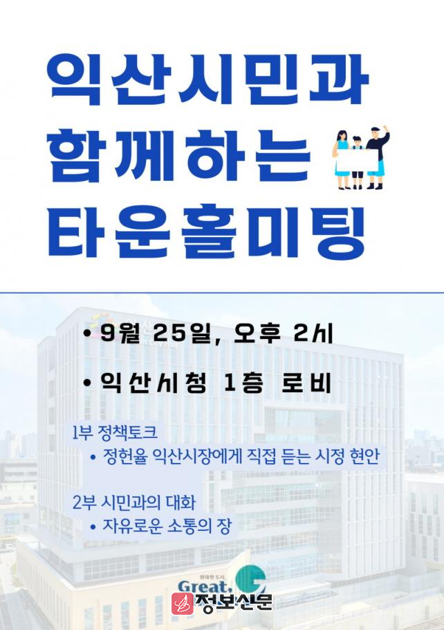 익산시는 오는 25일 오후 2시 시청 1층 로비에서 '시민과 함께하는 타운홀미팅'을 개최한다고 19일 밝혔다.