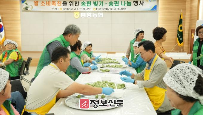 이번 행사는 우리 쌀 소비 촉진에 기여하고 모두가 함께 풍성한 한가위를 보낼 수 있도록 봉황농협과 행복나눔봉사단(회장 박득초)에서 추진하였으며 정성껏 빚은 송편은 마을 회관과 돌봄 대상 어르신 가구 등 152개소에 전달했다.