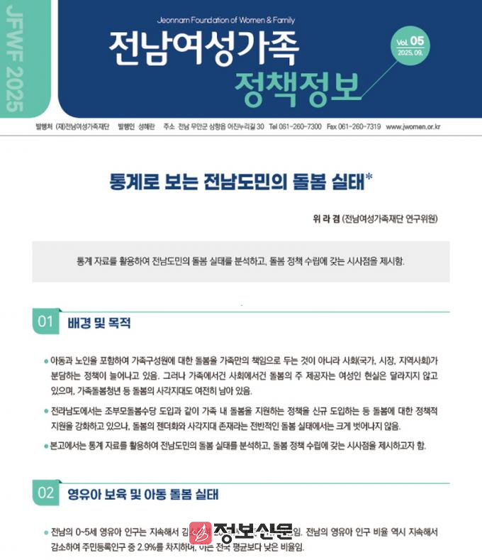 ![]() 전남여성가족재단, 통계로 보는 전남도민의 돌봄 실태 정책정보 발간 |