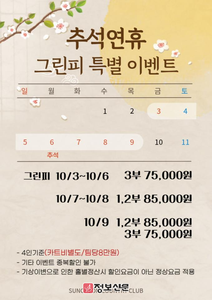 10월 3일부터 9일까지 진행한 이벤트는, 연휴 첫날인 3일부터 6일까지 3부 야간 라운딩 비용이 7만5천원에 할인이 적용된다. 이어 7일과 8일에는 주간(1‧2부) 라운딩이 8만5천원, 한글날인 9일에는 주간 8만5천원, 야간 7만5천원으로 금액을 낮춘다.