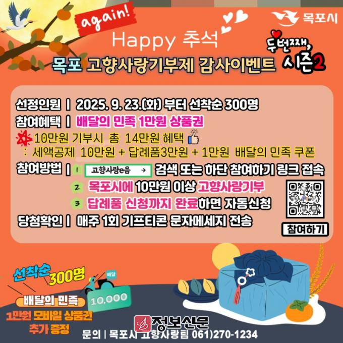 ![]() 목포시, Happy 추석~ 고향사랑기부 감사이벤트 시즌2 추진 |