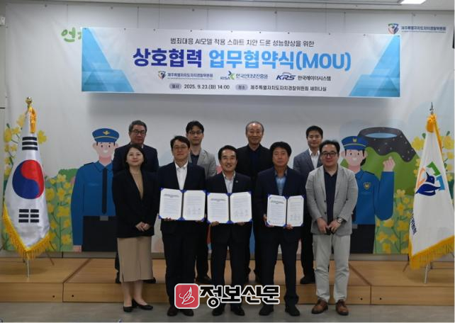 제주자치경찰위원회(위원장 박영부)는 23일 한국인터넷진흥원(KISA), 한국레이더시스템과 인공지능 성능 고도화를 위한 업무협약(MOU)을 체결하고 본격적인 범죄예방 인공지능(AI) 드론개발에 나선다고 밝혔다.