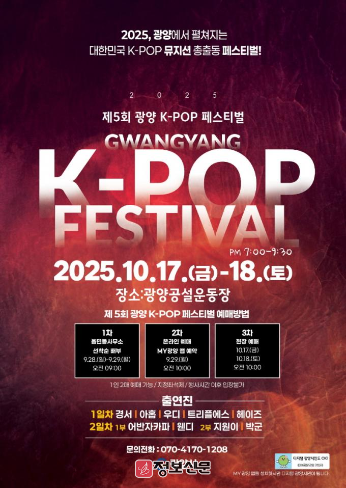 ![]() 광양시, 제5회 광양 K-POP 페스티벌 입장권 9월 29일 10시 ‘MY광양’앱 티켓오픈 |